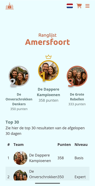 Aan het einde van de tour hebben jullie alle raadsels opgelost en het mysterie ontrafeld. Op het scherm verschijnt jullie score, samen met jullie teamfoto en naam op het digitale scorebord.